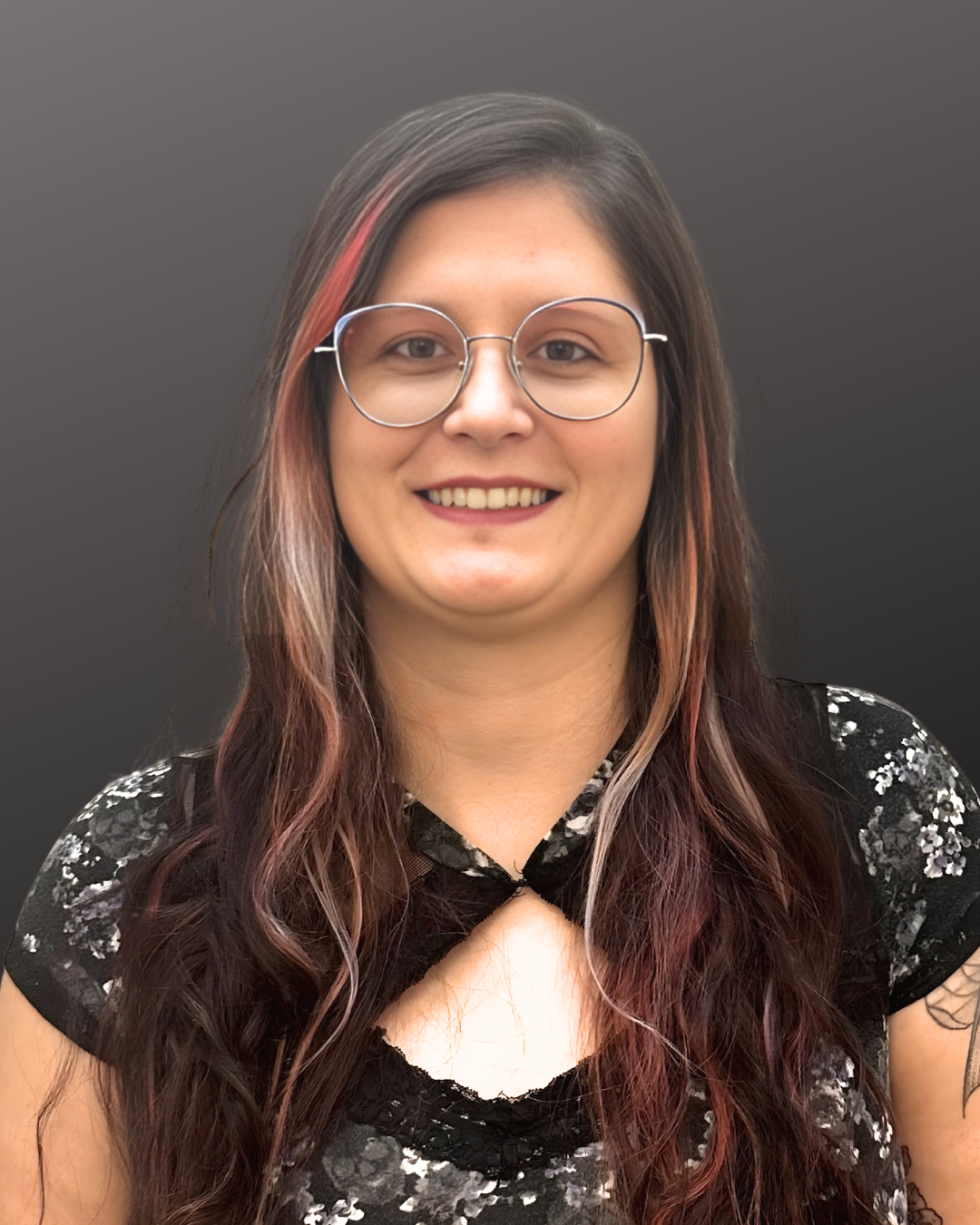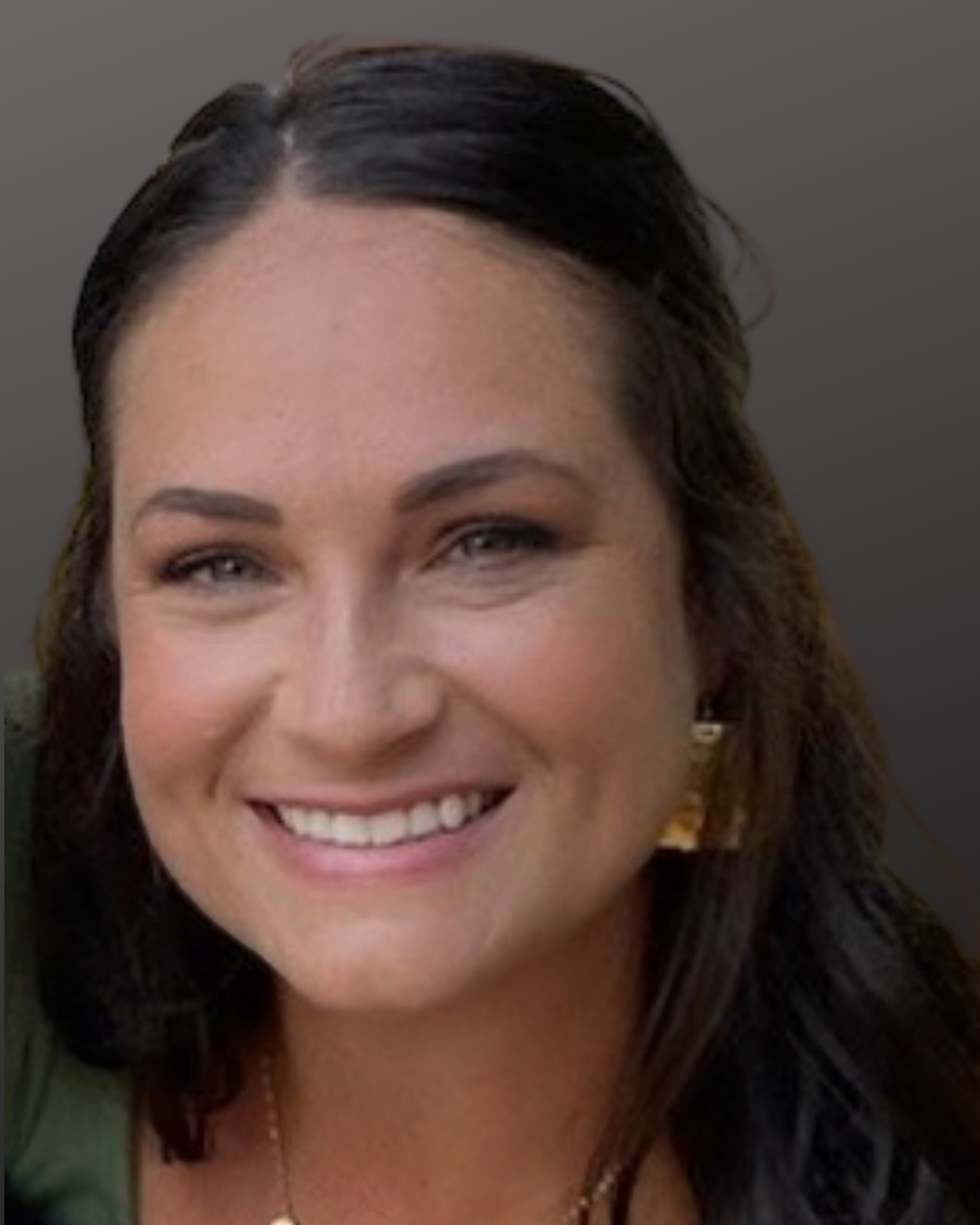 • A woman with shoulder-length brown hair smiling at the camera, wearing a black blouse, against a gray background.