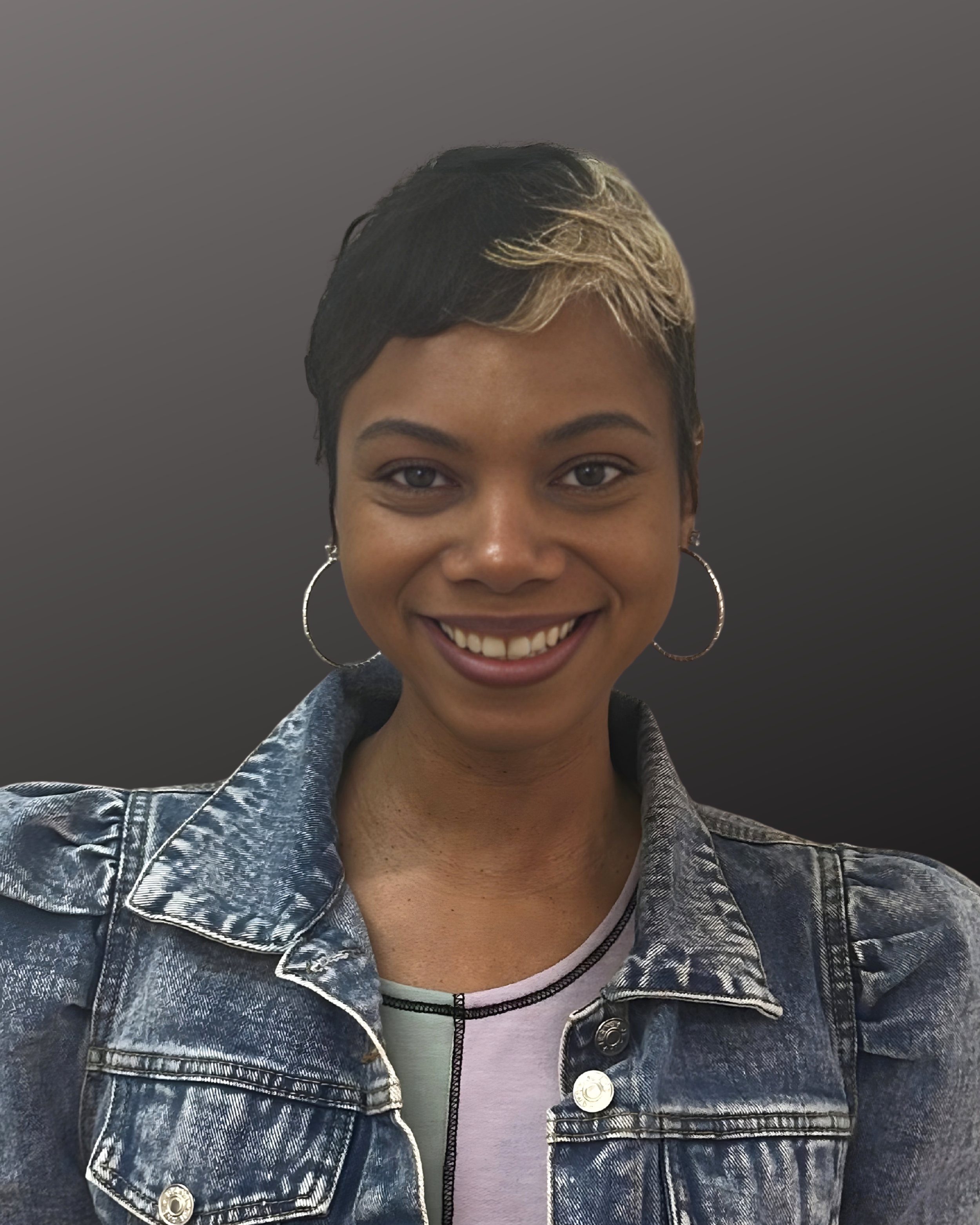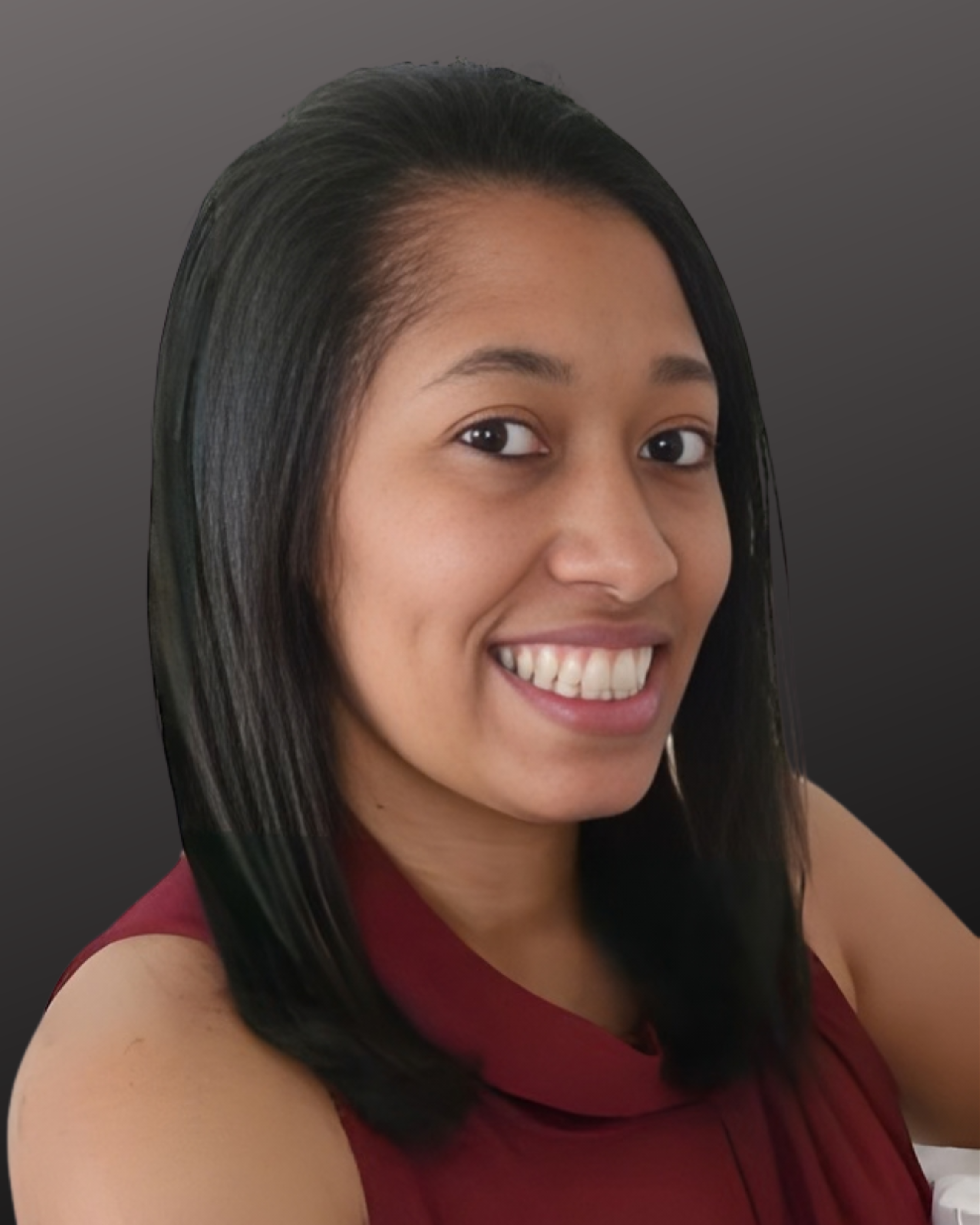 • A young woman with long brown hair, smiling, wearing a purple top, with a gray background.